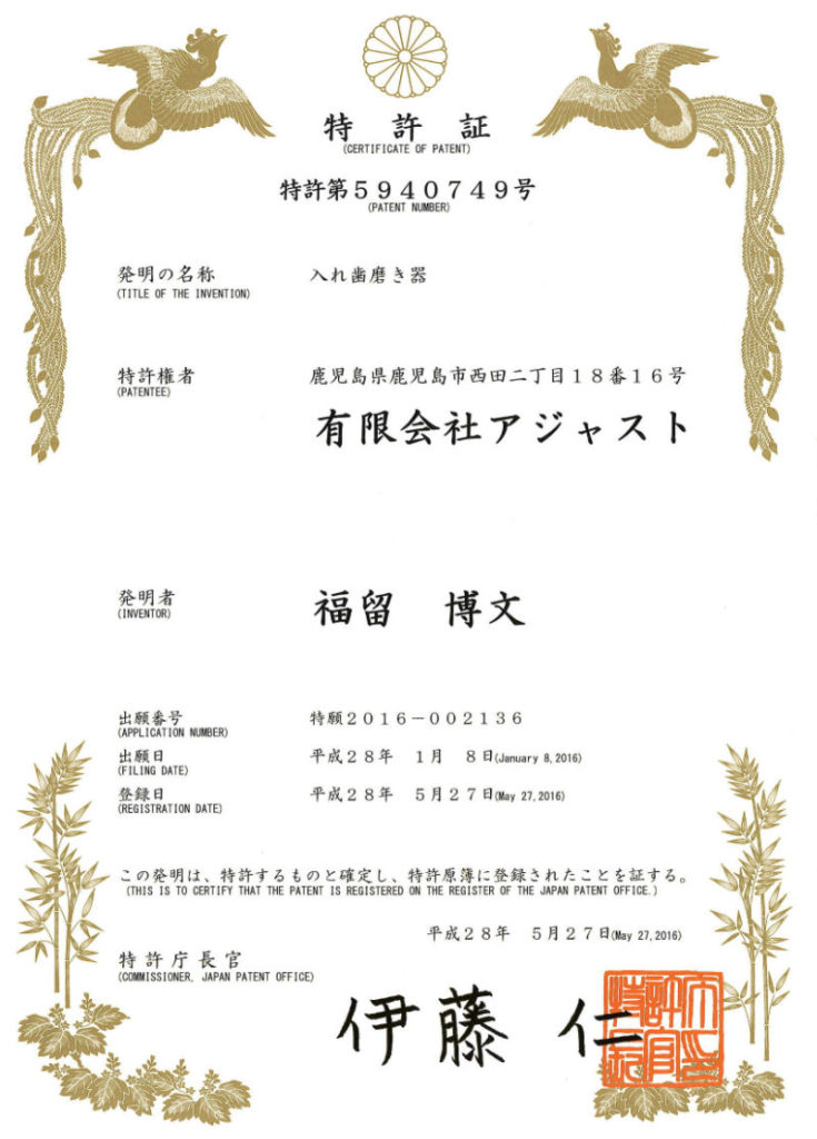 「入れ歯磨き器」の発明として、平成28年、特許庁より『特許第5940749号』認定されました。